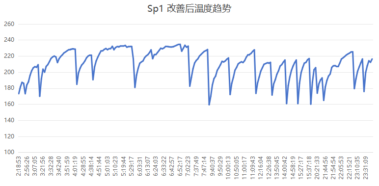 圖7 通過(guò)數(shù)據(jù)分析和模具異常的檢查,發(fā)現(xiàn)模具內(nèi)部冷卻水路接口漏水,導(dǎo)致模具溫度無(wú)法及時(shí)有效降至合理范圍以內(nèi),通過(guò)維修處理,得到改善。如圖8、9是改善后數(shù)據(jù)。