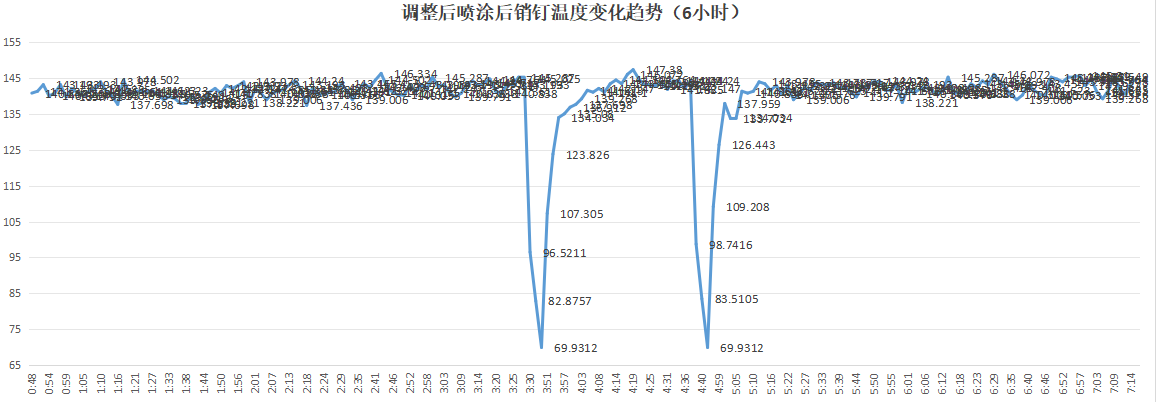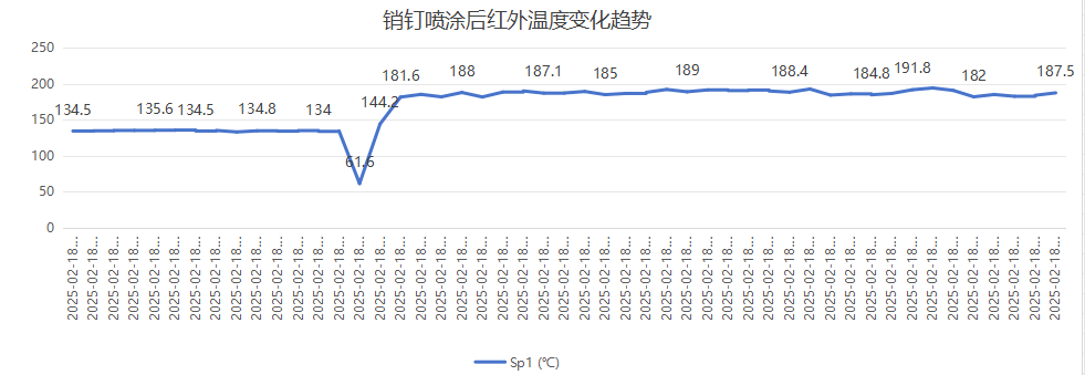 圖9 4結(jié)論 本研究通過(guò)引入模溫控制系統(tǒng),成功解決了壓鑄生產(chǎn)中因冷卻不均導(dǎo)致的零部件開裂問題。實(shí)驗(yàn)結(jié)果表明,噴涂后的模具溫度應(yīng)迅速降至150℃左右,但在未使用熱成像技術(shù)之前,銷釘部位的溫度仍維持在207℃,遠(yuǎn)高于標(biāo)準(zhǔn)要求,這直接導(dǎo)致了生產(chǎn)過(guò)程中頻繁出現(xiàn)的零部件開裂現(xiàn)象。通過(guò)熱成像技術(shù),及時(shí)發(fā)現(xiàn)了冷卻系統(tǒng)在該部位存在的問題,進(jìn)而對(duì)冷卻系統(tǒng)進(jìn)行了針對(duì)性調(diào)整。調(diào)整后的模具冷卻效果顯著改善,銷釘部位的溫度成功降至156℃,消除了開裂問題。 實(shí)驗(yàn)數(shù)據(jù)進(jìn)一步驗(yàn)證了模溫控制系統(tǒng)在提升壓鑄質(zhì)量方面的有效性,特別是在確保模具溫度均勻降低和優(yōu)化冷卻過(guò)程方面的優(yōu)勢(shì)。通過(guò)精準(zhǔn)的溫度監(jiān)控與及時(shí)的調(diào)整,本研究不僅提高了生產(chǎn)效率,還大幅降低了由于溫度控制不當(dāng)導(dǎo)致的質(zhì)量缺陷。實(shí)驗(yàn)結(jié)果的關(guān)鍵數(shù)據(jù),如銷釘部位的溫度由207℃降至156℃,為進(jìn)一步優(yōu)化模溫控制系統(tǒng)提供了可靠依據(jù),證明了熱成像技術(shù)在模具溫度監(jiān)測(cè)和控制中的重要作用,并且可以根據(jù)生產(chǎn)每模溫度變化提前預(yù)判停機(jī)期間若不增加人為干預(yù)情況下需要7模左右才能恢復(fù)正常生產(chǎn)狀態(tài)(如圖10所示),以此依據(jù)可以在停機(jī)后適當(dāng)增加關(guān)鍵部位溫度減少熱模時(shí)間減少產(chǎn)能損耗。這一改進(jìn)方案有效提升了壓鑄零部件的質(zhì)量,為壓鑄生產(chǎn)過(guò)程中的溫控技術(shù)應(yīng)用提供了寶貴的經(jīng)驗(yàn)。