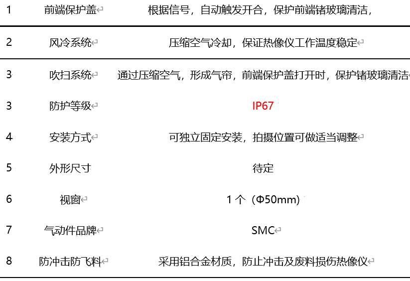 表1 2.2 熱像儀保護(hù)罩 為了確保紅外熱像儀在壓鑄工業(yè)現(xiàn)場(chǎng)的高溫、油霧和氣霧等嚴(yán)酷環(huán)境中能夠穩(wěn)定運(yùn)行,系統(tǒng)采用了專門設(shè)計(jì)的IP67級(jí)防護(hù)熱像儀保護(hù)罩。保護(hù)罩經(jīng)過(guò)工業(yè)現(xiàn)場(chǎng)的嚴(yán)苛考驗(yàn),具備卓越的密封性和抗污染能力,同時(shí)集成了多項(xiàng)功能性設(shè)計(jì),全面保障設(shè)備的長(zhǎng)期穩(wěn)定運(yùn)行。保護(hù)罩配備風(fēng)冷冷卻裝置,通過(guò)高效散熱技術(shù)有效控制設(shè)備內(nèi)部溫度,即使在極端高溫環(huán)境中也能維持設(shè)備性能。此外,保護(hù)罩前端設(shè)有氣簾和氣動(dòng)擋片,可形成清潔的氣流屏障,將油霧和氣霧有效隔離,確保鏡頭表面始終保持清潔狀態(tài),從而避免因污垢導(dǎo)致的成像質(zhì)量下降。該保護(hù)罩的防護(hù)性能不僅延長(zhǎng)了設(shè)備的使用壽命,也保證了模溫監(jiān)測(cè)的精確性和一致性。具體的保護(hù)罩性能參數(shù)如表2所示: