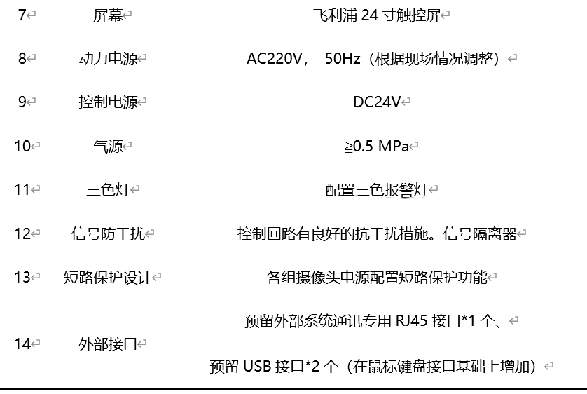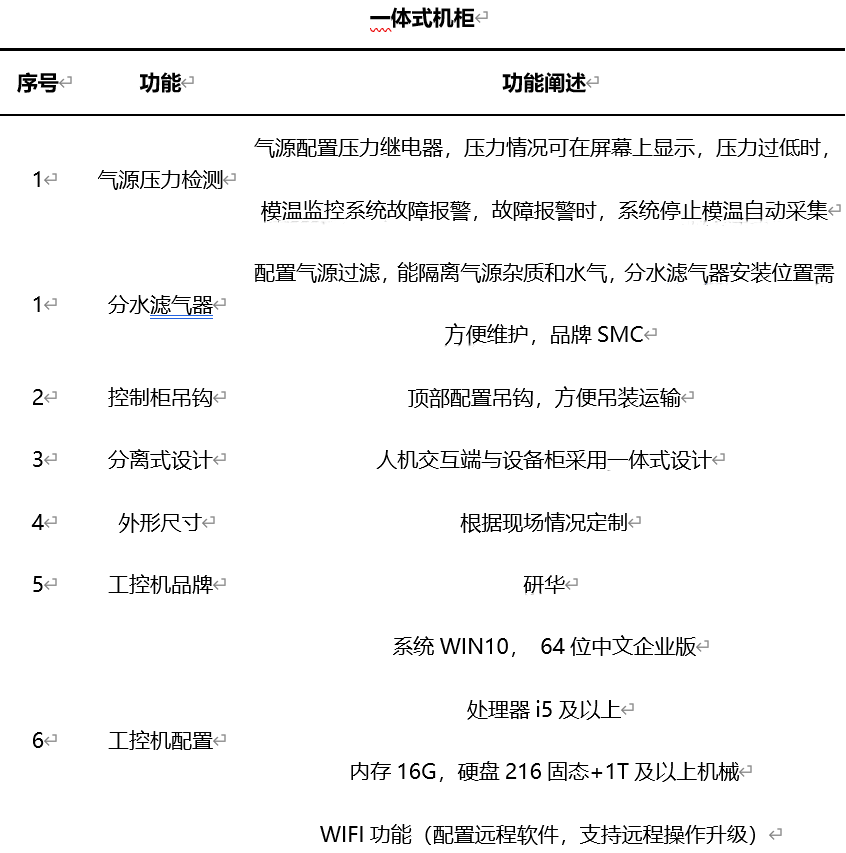 表2 2.3 一體式機(jī)柜 為保障模溫監(jiān)控系統(tǒng)在工業(yè)現(xiàn)場(chǎng)的高效運(yùn)行,系統(tǒng)采用功能齊全的一體式機(jī)柜設(shè)計(jì),將各類關(guān)鍵部件和功能集成于統(tǒng)一結(jié)構(gòu)中,兼顧便捷性和可靠性。機(jī)柜的設(shè)計(jì)細(xì)節(jié)充分考慮了壓鑄現(xiàn)場(chǎng)的實(shí)際需求,具備高性能、高耐用性和易維護(hù)性。機(jī)柜配備氣源壓力檢測(cè)裝置,通過(guò)壓力繼電器實(shí)時(shí)監(jiān)測(cè)氣源壓力,檢測(cè)結(jié)果直觀顯示在屏幕上。當(dāng)氣源壓力過(guò)低時(shí),系統(tǒng)將觸發(fā)故障報(bào)警,并停止模溫自動(dòng)采集,確保設(shè)備安全運(yùn)行。機(jī)柜還集成了分水濾氣器,用于高效過(guò)濾氣源中的雜質(zhì)和水氣,并便于維護(hù)。人機(jī)交互端與設(shè)備柜采用一體式設(shè)計(jì),結(jié)構(gòu)緊湊,頂部配置吊鉤,便于現(xiàn)場(chǎng)吊裝和運(yùn)輸。根據(jù)現(xiàn)場(chǎng)需求,機(jī)柜的外形尺寸可定制,以適應(yīng)不同的安裝環(huán)境。核心控制硬件為研華品牌工控機(jī),預(yù)裝64位中文企業(yè)版Windows 10系統(tǒng),配備i5及以上處理器、16GB內(nèi)存、216GB固態(tài)硬盤和1TB機(jī)械硬盤,同時(shí)支持WIFI遠(yuǎn)程操作及升級(jí)。交互界面采用飛利浦24英寸觸控屏,為用戶提供友好直觀的操作體驗(yàn)。供電方面,機(jī)柜支持AC220V 50Hz動(dòng)力電源和DC24V控制電源,可根據(jù)現(xiàn)場(chǎng)情況調(diào)整。系統(tǒng)設(shè)計(jì)有信號(hào)防干擾措施和短路保護(hù)功能,有效提升信號(hào)傳輸?shù)姆€(wěn)定性和設(shè)備運(yùn)行的安全性。此外,機(jī)柜配備三色報(bào)警燈,用于指示系統(tǒng)運(yùn)行狀態(tài)。其他功能包括預(yù)留外部系統(tǒng)通訊的RJ45接口及額外的USB接口,滿足多樣化的外部連接需求。設(shè)備整體氣源要求不低于0.5 MPa,以確保系統(tǒng)運(yùn)行的穩(wěn)定性和可靠性。這款一體式機(jī)柜通過(guò)高集成度和優(yōu)化設(shè)計(jì),為模溫監(jiān)控系統(tǒng)提供了堅(jiān)實(shí)的基礎(chǔ),能夠滿足壓鑄現(xiàn)場(chǎng)復(fù)雜環(huán)境中的多樣化需求。詳細(xì)的功能介紹如表3所示: