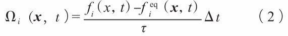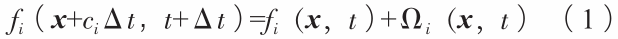 式中:i為第i離散速度方向,x為空間位置坐標,ci為第i離散速度分量,t為當前時刻,Δt為時間步長。fi(x+ciΔt,t+Δt)為x+ciΔt位置,t+Δt時刻密度分布函數,fi(x,t)為x位置,t時刻密度分布函數,Ωi(x,t)為碰撞項。 經過LBGK近似后得到: