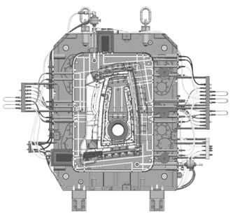 圖3 汽車車門壓鑄模具的溫控系 3 汽車車門壓鑄CAE分析 3.1 CAE 初始條件及邊界條件設置 壓鑄合金和模具材料的牌號和熱物性參數如表1所示。壓鑄工藝參數如表2所示,其中換熱模型為4D界面換熱模型,模型參數及取值分別為:擬合參數γ¹h 為8.92,γ²h 為28.33,ε為1.45,β¹h為-1.82,β²h為-5.32,材料牽引固相分數為0.7,換熱系數-凝固狀態擬合參數為1.05,換熱系數峰值匹配系數為2.5,最小換熱系數匹配系數為0.15,臨界模具表面溫度為275℃,臨界固相分數為0.8,模具間的傳熱系數為3000W/(㎡·K)。鑄件型腔網格最小尺寸為0.65mm,網格總數量為1.9億,網格剖分圖如圖4所示,其中黃色邊框區域為鑄件型腔網格。