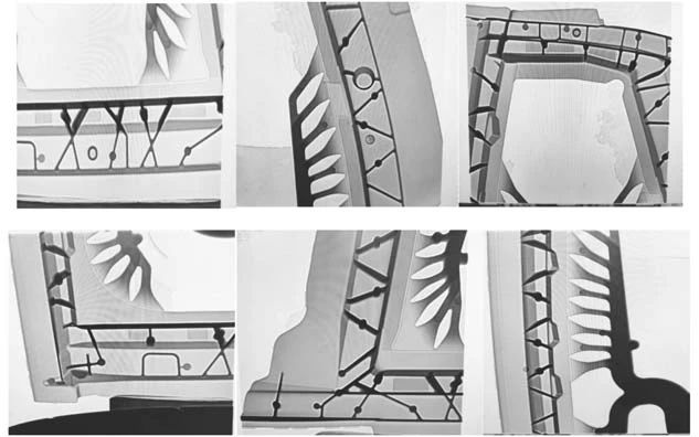 圖10 方案C鑄件不同位置點縮松縮孔的尺寸隨增壓壓力的變化趨勢 4 試驗驗證 利用力勁6 800 T壓鑄機進行汽車車門壓鑄試驗驗證。壓鑄工藝方案采用方案C,即采用勻加速壓射工藝,從0加速至臨界慢速速度1.23 m/s,高速速度為4.6 m/s,起高速位置為900 mm,增壓壓力為90MPa。經過機械加工去除澆道和集渣包等工藝系統后,車門鑄件凈重為5.56 kg。鑄件表面輪廓清晰,無裂紋、飛邊和冷隔等缺陷,質量優良。車門鑄件的X射線探傷檢測結果如圖11所示,鑄件內部無明顯氣孔和縮孔缺陷,驗證了優化方案能夠滿足生產要求。
