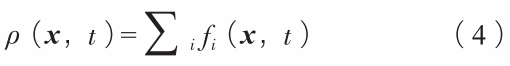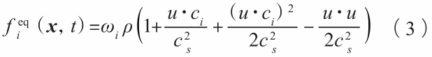 式中:ωi為第i離散速度方向上密度權重,ρ為流體的密度,u為當前位置時刻的流體速度,cs為格子聲速,τ為松弛時間。 宏觀場密度由下式給出: