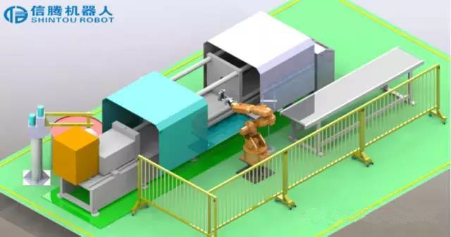 ![]() 目前在中國大陸主流鋁合金壓鑄機品牌普遍在600噸以下,按國產主流壓鑄機品牌供應商:力勁、伊之密、益格、仁興、銳達、捷迅、震高等提供的銷售資料統計,600噸以下的臺數在85%左右。傳統的壓鑄自動化普遍采用“三手”,即給湯機、噴霧機(伺服噴霧機或氣缸銅管噴霧機)、取件手(伺服或電動)的方式實現。 隨著90后年輕一代不愿進入壓鑄車間這樣艱苦危險的工作環境,傳統的三手壓鑄自動化對節省人工有限,且不具備通用性,產品的切邊去水口工作還需人工完成,壓鑄行業尤其是廣大民營企業的整體自動化程度不高,壓鑄行業的傳統自動化技術急需轉型升級,傳統三手使用3-5年也需要淘汰更新,壓鑄廠的企業主逐步將目光轉向機器人企業,想尋找一種更好的自動化方案以解決長期困擾的問題:如何接更高質量要求的壓鑄件訂單?如何留住年輕一代工人在壓鑄行業? 傳統的三手雖然解決了大部分的壓鑄自動化需求,解放了部分人工。但其推廣實施對產品有很大標準要求,不具備通用性。如產品壓鑄前要放預埋件就無法實現,在東莞曾有壓鑄廠操作工在放預埋件時,誤操作將整條手臂被模具夾碎。給個人和工廠造成了極大的損失。 對于復雜產品:如環形產品、深腔類產品、散熱片產品等,對于噴脫模劑和模具清理有特殊要求的,傳統伺服噴霧機因為缺乏靈活性,無法達到要求,壓鑄廠即使裝了伺服噴霧機也只能停下由人工操作,才能打出合格產品。但是人工操作有其不穩定性,每模噴的脫模劑和吹氣清理方式不一致,導致產品合格率偏低。 傳統噴霧機和取件手,其結構決定了摩擦副是無保護外露方式,潤滑很難保證。在壓鑄灰塵、水汽嚴重的環境,其使用壽命普遍在3-5年,且售后維護量大,壓鑄廠停用率較高。 針對傳統三手在壓鑄自動化領域的局限性,信騰機器人壓鑄自動化事業部推出了與傳統三手接近市場價格的關節機器人自動化解決方案。采用壓鑄關節機器人方案不僅能覆蓋傳統三手的功能,還能彌補傳統三手的缺陷。 針對不同壓鑄企業對壓鑄自動化程度的不同要求,信騰機器人提供了最基本的五種解決方案: 一、采用機器人取噴一體的方式,產品取出后放入傳輸線,由人工完成清理渣包水口。特點:適合于深腔、異形零件,不方便采用切邊機去水口渣包的產品。如下圖: