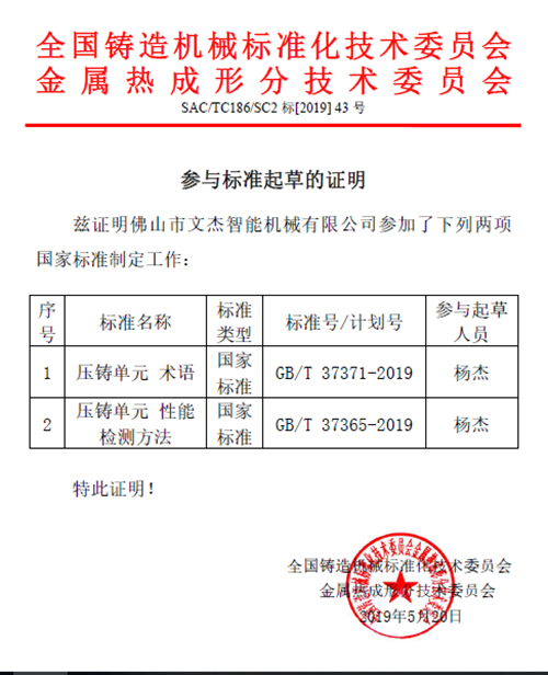 佛山市文杰智能機械有限公司(“文杰智能”)積極參與壓鑄行業各類標準制定。2017年,更是加入全國鑄造機械標準化技術委員會金屬熱成形分技術委員會(TC186/SC2),在TC186/SC2領導下,與會員單位一道參與多項行業標準的起草,成為包括《壓鑄單元 術語》GB/T 37371-2019、《壓鑄單元 性能檢測方法》GB/T 37365-2019國家標準的起草單位。