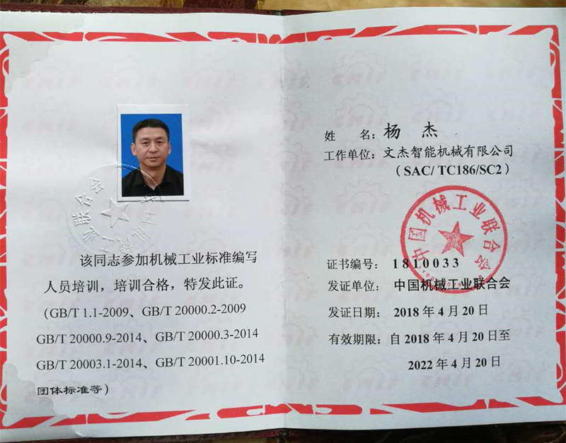 文杰智能公司董事長楊杰先生是壓鑄行業標準制定的堅定支持者,以上國家標準的起草,其本人積極參與其中,成為這兩項國家標準的主起草人之一。而為了提高在標準編寫方面的專業水平,楊杰先生主動參加中國機械工業聯合會組織的機械工業標準編寫人員培訓班,并取得專業證書。