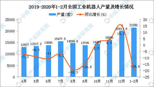 據中商產業研究院數據庫顯示,2020年1-2月全國工業機器人產量波動幅度不大,全國工業機器人產量為21292套,同比下降19.4%。