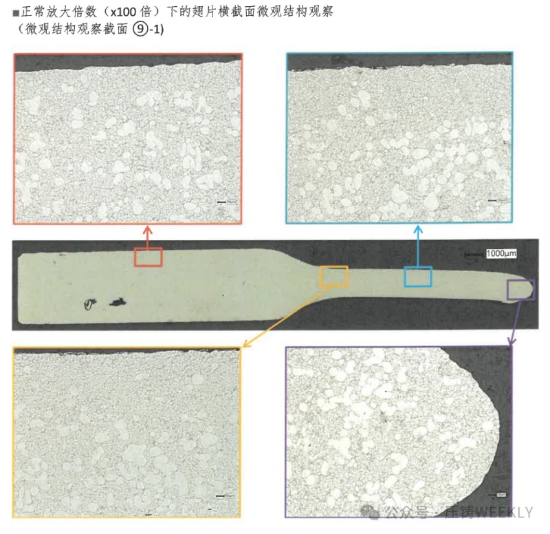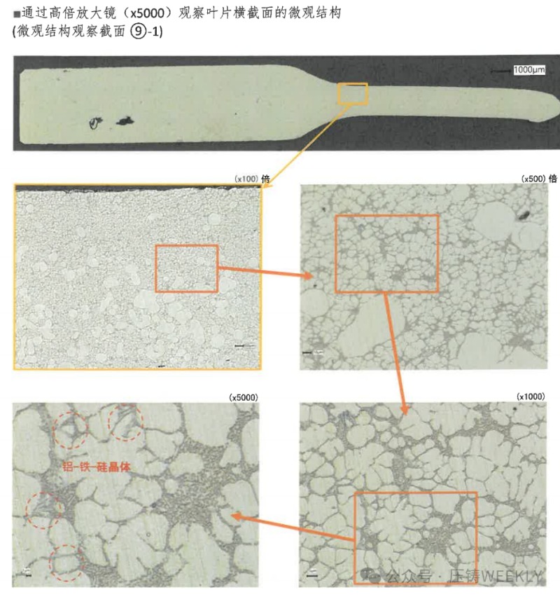 ![]() 原標題:技術驗證:宇部對康普泰克流變壓鑄法的微觀結構表現分析 宇部興產機械株式會社(UBE Machinery)近期對康普泰克(Comptech)Rheocast 流變壓鑄法生產的散熱器翅片進行了系統的微觀結構分析,其結果為高性能薄壁鑄件制造提供了重要技術參考。 本次分析對象為高度 105mm、頂部寬度 0.8-1.0mm、斜度 0.5-1° 的散熱器翅片,采用 EN42000 合金材質 —— 該材質為 A356 的 100% 再生材料,含硅 6.95%、鐵 0.3%,且未添加 Sr 等細化精煉元素。通過微觀觀測發現,翅片從 3mm 厚底部至 1mm 厚頂端的全域組織呈現高度均質性:基體由粒徑約 50μm 的初生鋁球狀顆粒構成,顆粒間隙分布極細 α 相鋁,二者間隙中則形成共晶硅結構(灰色區域),整體僅含少量卷氣與縮孔,金屬包裹完整性優異。