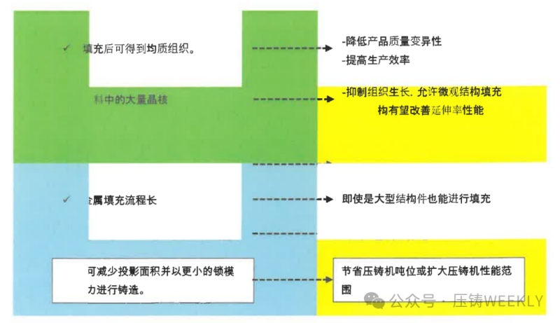 對比傳統工藝,該技術展現出顯著優勢。傳統半熔融 / 半固態成形工藝中,薄壁翅片區易出現共晶 Si 相偏析問題,而康普泰克流變壓鑄法通過在澆注湯勺內生成大量晶核,有效抑制了共晶 Si 偏析。這一特性使得未熱處理的壓鑄材料抗拉性能(尤其延伸率)大幅提升,為改善大型車身、底盤壓鑄件的沖擊吸收能力提供了可行路徑。