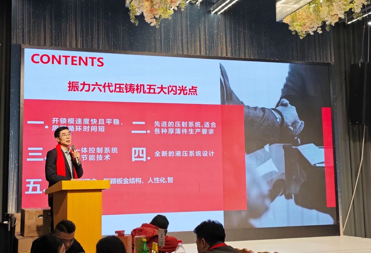 振力機械總工程師惠建學先生作報告 晚會的技術宣講環節干貨滿滿,為現場嘉賓帶來一場行業前沿分享。振力機械總工程師惠建學先生以《振力第六代系列壓鑄機》為題分享,該機型傳承公司二十五年制造經驗,契合行業新需求,融合先進機械設計、前沿控制技術及仿真液壓設計,是集實力與智能于一體的標桿產品。其核心優勢聚焦三大維度:優化機鉸結構并搭載 AI 算法,實現開鎖??焖倨椒€、循環周期短且重復精度高;升級壓射系統,優化關鍵部件并采用雙控制模式,普通機高性價比、高配機數字化操控,適配各類厚薄件生產;搭載四機一體控制系統與伺服節能技術,提升布局合理性與效率,降低噪音和油溫。 此外,該機型迭代液壓系統,提高壓力、優化管路,采用無焊接聯接技術及德國派克液控單向閥,保障運行穩定;融入歐洲設計理念,以新穎板金結構為基礎,在關鍵部位設置多重防護,實現人性化、智能化安全保障。這款匯集多項核心技術的壓鑄機,將為高精密、高要求鑄件生產提供優質解決方案,助力客戶創造更高價值與投資回報。