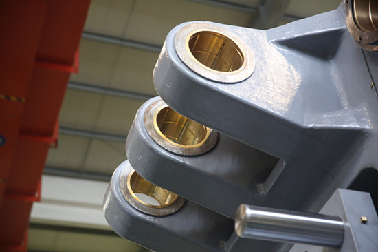 鉸耳孔增加鋼套和銅套,改善機絞磨損 另外,H系列2500T以上的重型壓鑄機都采用HPM的高剛性鎖模機構,有6根大杠(原本國內機都是采用四根大杠受力),3500T以上的模板甚至更是采用鍛鋼材質,比歐洲、日本的部分機器用料成本更高,更加穩定耐用。 “我們的研發目標是要讓H系列重型機具備世界級的競爭力,以它重新定義中國重型壓鑄機新標準。”黎前虎說道。 為全球市場高端壓鑄件生產商量身定制 隨著新能源車結構件需求越來越多,國內重型機市場也快速增長,但對重型機而言,客戶最看重的就是生產穩定性和合格率,所以大多龍頭企業客戶更青睞質量更高的進口機。這也給了伊之密一個警示,重型機要定位高端市場。 “也因此,我們才有決心和勇氣消化HPM技術標準,提升H系列的制造成本,舍得用料,例如重型大杠調模螺母,我們將原本國內機普遍使用鋼材改為按歐洲日本重型機標準使用的特殊銅合金,有效解決了鋼螺母易燒蝕至變形和調模不動的問題,但光這一項每臺機的成本便高出十幾萬人民幣!”