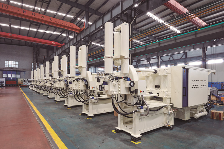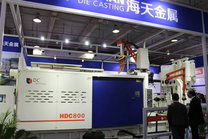 海天金屬車間 據(jù)了解,海天金屬HDC800-SF伺服冷室壓鑄機,配套給湯機、噴霧機、取件機組成自動化生產(chǎn)單元,可有效減少操作人員、提高生產(chǎn)效率和產(chǎn)品品質(zhì)。海天金屬HDC冷室壓鑄機,采用了多項行業(yè)先進技術:工字鋼結構機架、特殊結構模板/哥林柱、內(nèi)澆鑄鋁青銅調(diào)模螺母、日本LUBE潤滑系統(tǒng)、打料整體油路板、海天專利快速充液閥、非接觸式磁致尺等,整機具有鎖模力大、開合模速度快、運動沖擊小、打料速度快、建壓時間短、重復精度高、安全、穩(wěn)定、可靠等特點。 據(jù)介紹,為滿足汽配客戶對大型機的需求,明年,海天金屬將大型機由目前的1300噸(鎖模力)提升至4000噸,目前已完成技術儲備及設計研發(fā)工作。同時,明年底,面向全球高端壓鑄客戶的HDM(Die Masting系列)系列冷室壓鑄機正式推向市場。該系列機型由海天金屬與德國專業(yè)研發(fā)團隊共同開發(fā),壓射系統(tǒng)在德國組裝和測試完成后,原裝進口到國內(nèi)進行整機裝配。