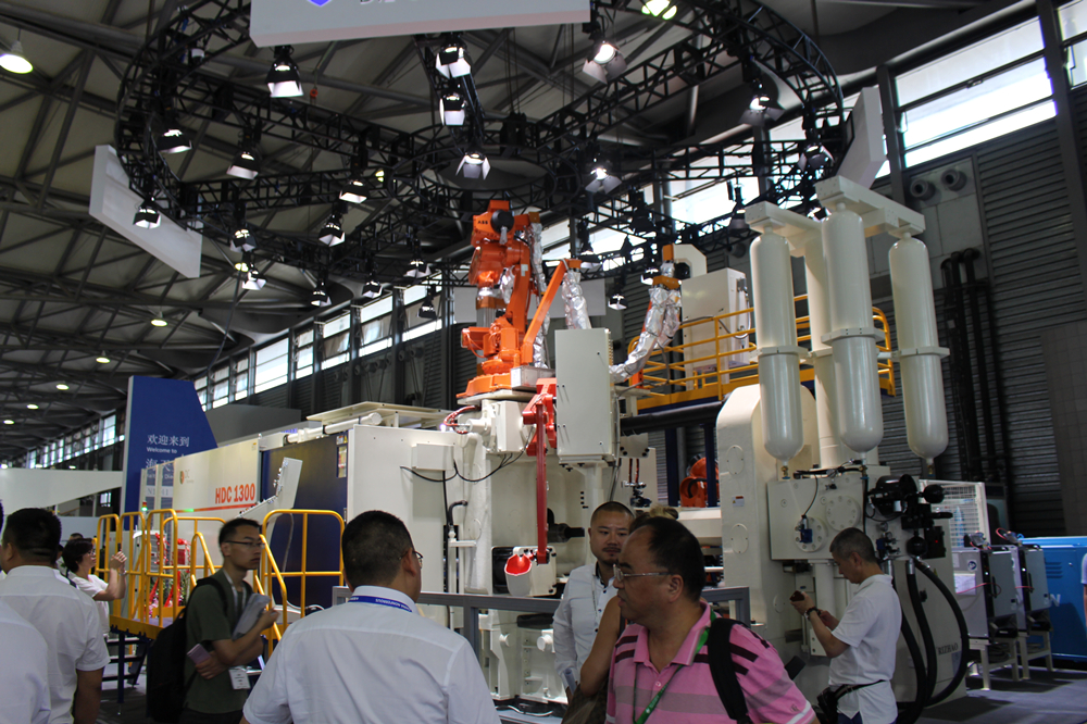 海天雙閉環全實時控制壓射系統演示內容 展會現場,海天金屬坐擁319平方米展位面積,在N1A41展示一套以HDC1300-RTC為主機冷室壓鑄單元及壓鑄后加工中心CFV1100。據悉,該配置雙閉環實時控制系統HDC1300-RTC冷室壓鑄機為全場最大噸位的機型,與取件機器人、噴霧機器人、給湯機、去渣包機、模溫機、點冷機,并形成聯動,組成自動化生產單元。 |