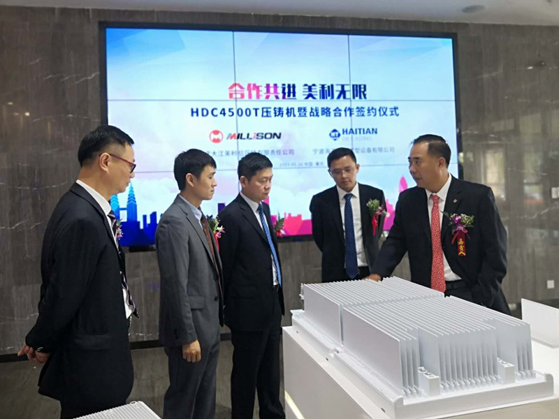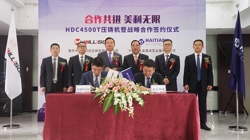 ![]() 雙方高層見證簽約儀式 2019年5月16日,重慶巴南,寧波海天金屬成型設備有限公司與重慶大江美利信壓鑄有限責任公司戰略合作發布會暨HDC4500T壓鑄島簽約儀式隆重舉行。海天集團與美利信壓鑄相關領導、重慶鑄造行業協會相關領導及壓鑄企業嘉賓、行業媒體朋友共同出席了發布會。 海天速度,刷新紀錄 作為此次簽約的一部分,美利信壓鑄向海天金屬重慶銷售公司購買一套HDC4500T壓鑄島。該4500T壓鑄機系海天金屬迄今為止最大噸位的壓鑄機,也是國內最大的壓鑄機之一。