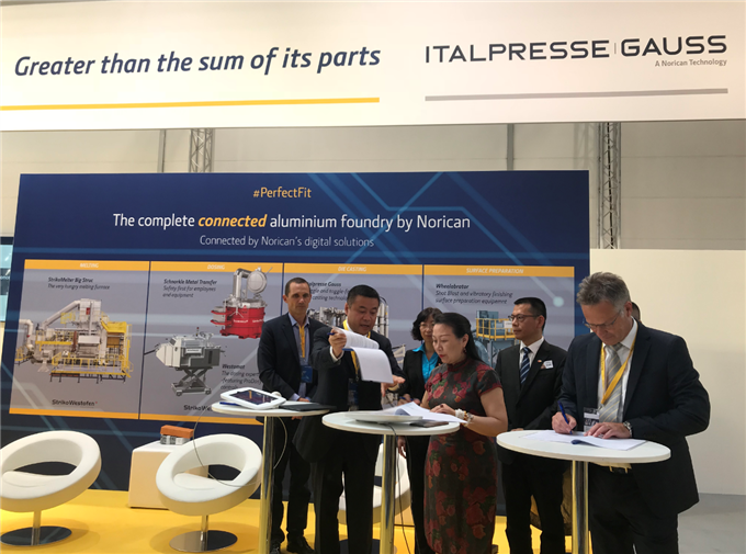 ![]() 壓鑄周刊(2019年6月28日 深圳)德國時間6月26日,在2019德國GIFA諾瑞肯集團(tuán)展臺,中國濟(jì)南慧成鑄造有限公司與諾瑞肯集團(tuán)簽訂設(shè)備購買協(xié)議,此次購買的3臺壓鑄機(jī)設(shè)備,包括中國首臺進(jìn)口4400噸高壓壓鑄機(jī)一臺、3700噸高壓壓鑄機(jī)一臺,以及國產(chǎn)首臺1850噸高壓壓鑄機(jī)一臺。 作為諾瑞肯集團(tuán)旗下品牌之一意特佩雷斯高斯,由意特佩雷斯Italpresse與高斯Gauss合并而來,高斯Gauss主要為客戶提供重力鑄造設(shè)備、低壓鑄造設(shè)備以及自動化周邊設(shè)備,意特佩雷斯Italpresse主要提供款式多樣、技術(shù)領(lǐng)先的壓鑄機(jī)。 濟(jì)南慧成是較早從事鋁合金壓鑄領(lǐng)域,對壓鑄設(shè)備還是壓鑄件都有很高的要求,此次簽約意特佩雷斯高斯壓鑄機(jī)設(shè)備,就是看重意特在壓鑄機(jī)領(lǐng)域的先進(jìn)技術(shù)和高品質(zhì)的服務(wù),這也為今后雙方加強(qiáng)合作提供了可靠的互信。
