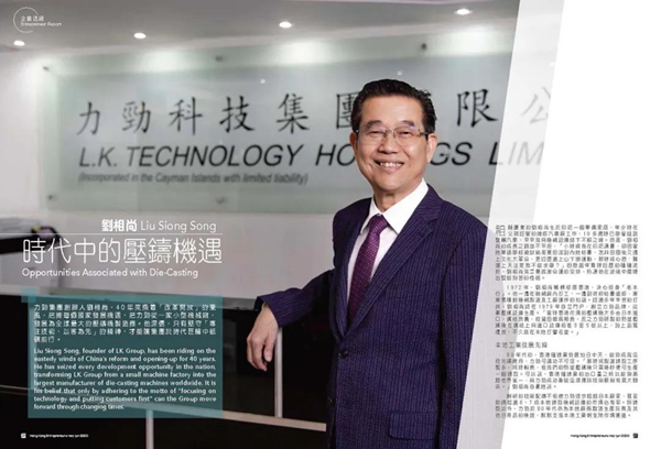 Liu Siong Song, founder of LK Group, has been riding on the easterly winds ofChina’s reform and opening-up for 40 years. He has seized every developmentopportunity in the nation,transforming LK Group from a small machine factoryinto the largest manufacturer of die-casting machines worldwide. It is hisbelief that only by adhering to the motto of “focusing on technology andputting customers first” can the Group move forward through changing times.