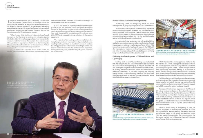 In 1972, Liu moved to Hong Kong and was determined to take up his “old business”. Whileworking in a machine factory, he also studied in night school to learn moreabout machine manufacturing and factory operations. After years of hard work,Liu started his own business with the brand name LK in 1979 and engaged in theproduction of die-casting equipment.