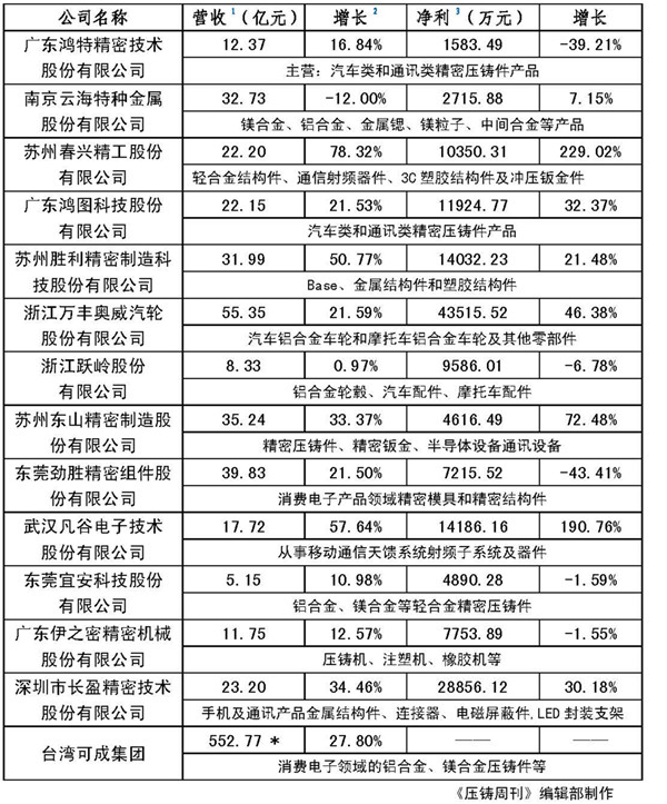 二月是上市公司集中披露上年度業(yè)績的月份,壓鑄周刊編輯部根據(jù)已披露的上市公司2014年業(yè)績快報,以營業(yè)收入、凈利潤及它們的增長率四項指標為基礎(chǔ),匯總了14家壓鑄 企業(yè)業(yè)績數(shù)據(jù)。數(shù)據(jù)顯示,14家企業(yè)當中,只有1家企業(yè)營業(yè)收入出現(xiàn)負增長,2家企業(yè)凈 利潤出現(xiàn)較大幅度的下滑。14家企業(yè)分布于壓鑄產(chǎn)業(yè)鏈上中下游,具有良好的代表性,因此,總體數(shù)據(jù)反映了2014年整個行業(yè)保持快速穩(wěn)定的發(fā)展態(tài)勢。 展望2015年,汽車制造、消費電子兩大用戶行業(yè)保持穩(wěn)定增長勢頭毋庸置疑,隨著央 行降準、降息政策進一步落實,房地產(chǎn)市場今年將繼續(xù)回暖,拉動另一用戶行業(yè)建材業(yè)需求增長,有鑒于此,我們認為,2015年壓鑄行業(yè)將運行于穩(wěn)健發(fā)展“新常態(tài)”的 軌道上, 增長可期。