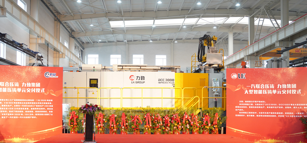 一汽聯(lián)合壓鑄總經(jīng)理彭容林先生擔(dān)綱活動(dòng)主持 力勁大型智能壓鑄單元交付 此次力勁大型智能壓鑄單元交付,為交鑰匙工程,力勁交付了DCC3000、DCC1600兩套大型壓鑄單元,實(shí)現(xiàn)全自動(dòng)化、智能化的壓鑄生產(chǎn),有效提升生產(chǎn)效率、合格率,減少人力、降低生產(chǎn)成本。