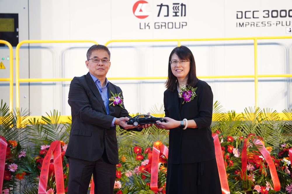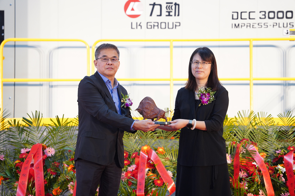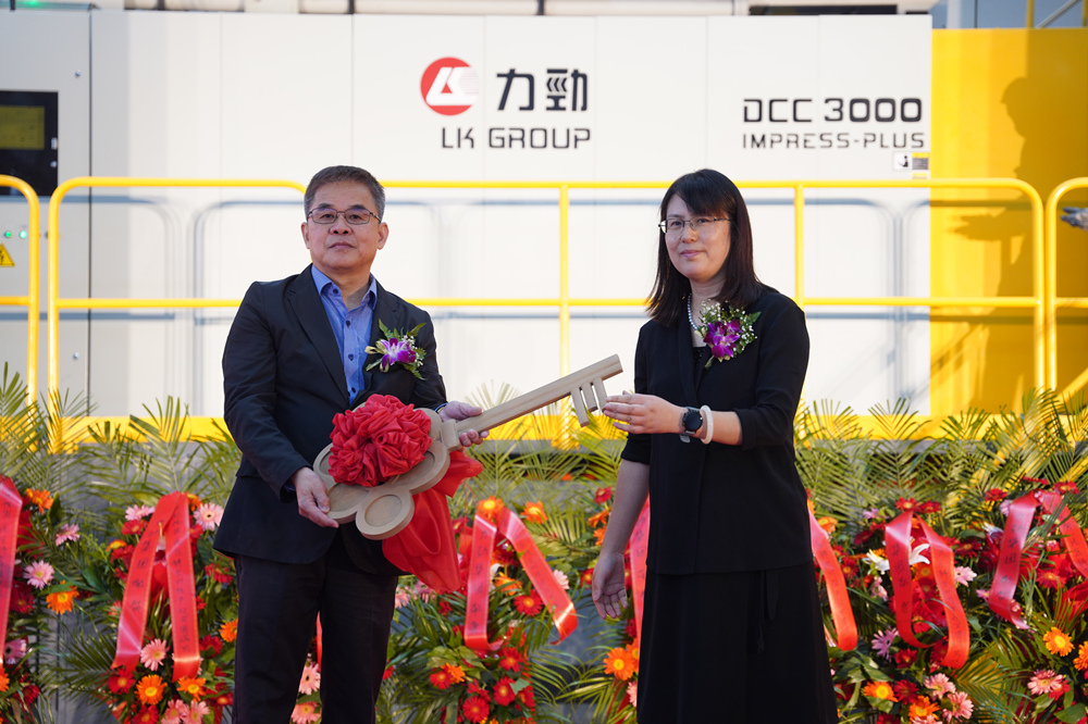 一汽聯(lián)合壓鑄董事長(zhǎng)洪紳福與力勁集團(tuán)深圳領(lǐng)威科技有限公司總經(jīng)理潘玲玲進(jìn)行設(shè)備交接