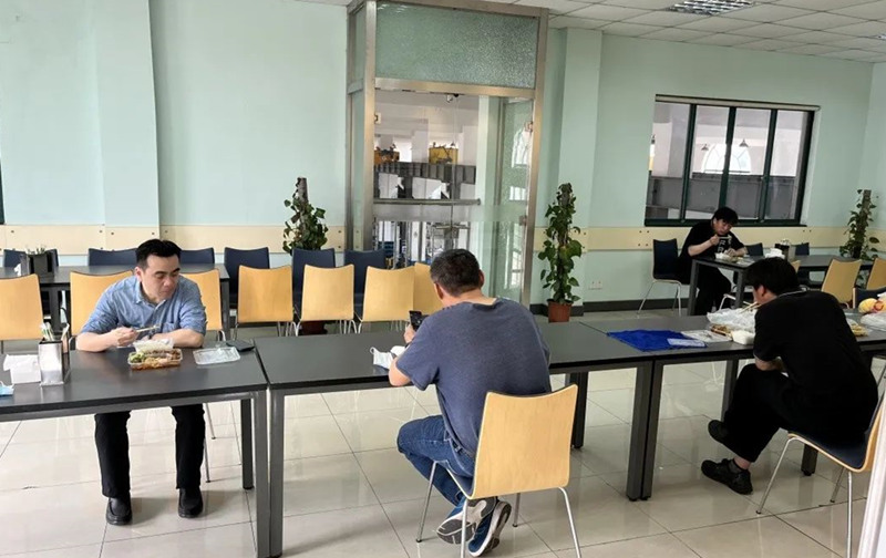 平日熱鬧的食堂,如今有了點“距離”感 下午 13:00 園區(qū)領(lǐng)導(dǎo)來訪,檢驗防疫措施 午休過后,下午的工作有序按照計劃展開。13:00左右,錢橋園區(qū)領(lǐng)導(dǎo)一行來訪,檢驗并指導(dǎo)富來的防疫工作,察看復(fù)工情況。園區(qū)領(lǐng)導(dǎo)對富來細(xì)致、嚴(yán)格的各項防疫措施表示滿意。