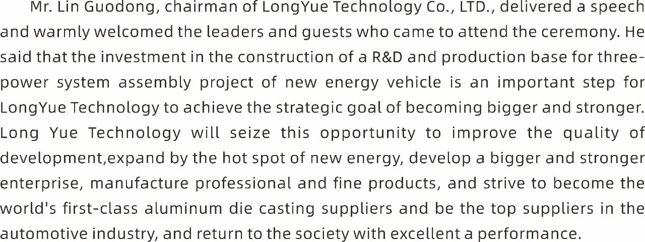 隆躍科技董事長林國棟先生發表致辭,對前來參加慶典儀式的各位領導及來賓表示熱烈的歡迎。他表示,投資建設新能源汽車三電系統總成項目研發與生產基地,是隆躍科技實現做大做強戰略目標的重要一步!隆躍科技將抓住本次機遇提質發展、乘勢而上,做大、做強企業,做專、做精產品,努力成為世界一流的鋁壓鑄供應商和汽車行業的頂級供應商,以更加優異的業績回報社會。