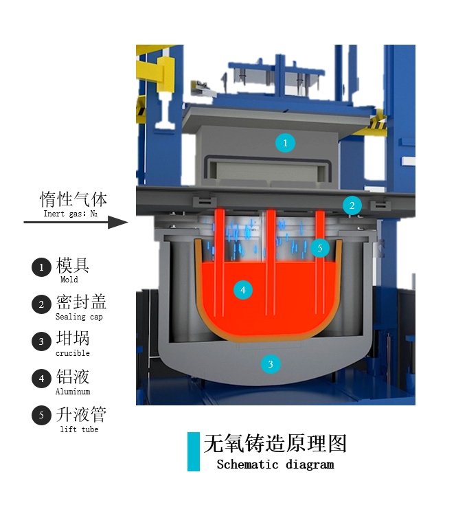 據悉,該無氧鑄造機通過施加500~1000mbar的低壓,使鋁水通過升液管平穩注入模具中。在鑄造過程中,設備能夠精確控制升壓速度和填充速度,從而有效防止氧化皮和氣泡的形成,確保鋁鑄件的高品質。此外,無氧鑄造技術還具備出色的補縮能力,鑄件組織致密,可輕松實現大型薄壁復雜鑄件的制造,且金屬收得率高達80%-95%,大大提高了生產效率。 慧臻科技的技術負責人丁陽表示:“我們這款無氧鑄造機的核心優勢在于無氧環境控制。通過抽真空與惰性保護氣體(如氮氣、氬氣)的聯合使用,我們能夠將鑄造環境中的氧含量降至極低水平,有效防止金屬熔液氧化。這一創新不僅提高了鑄件的純度和質量,還使得鑄造過程更加環保、無污染。”