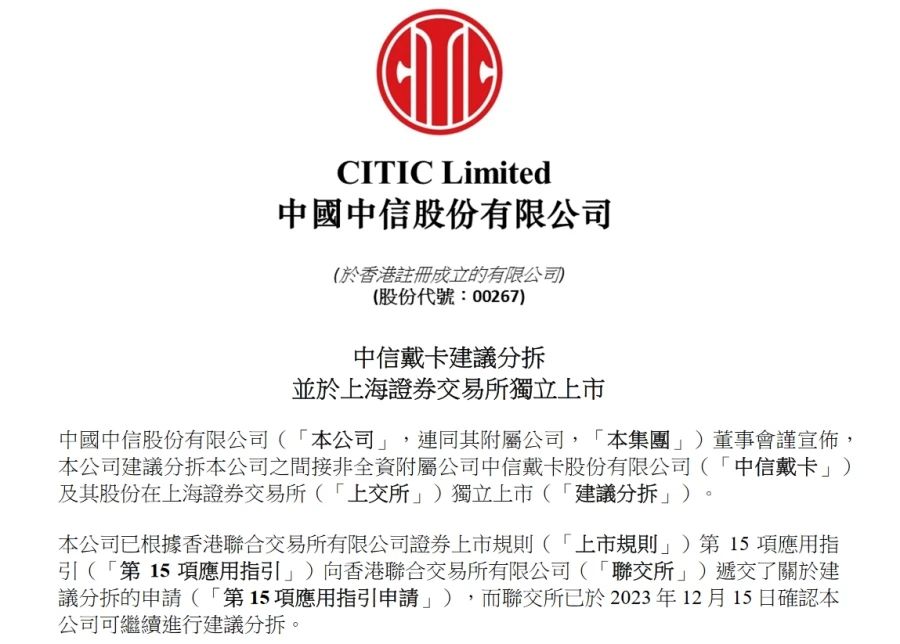 12月18日,中信股份在港交所發(fā)布公告,建議分拆其間接非全資附屬公司——中信戴卡股份有限公司的股份在上海證券交易所獨(dú)立上市。