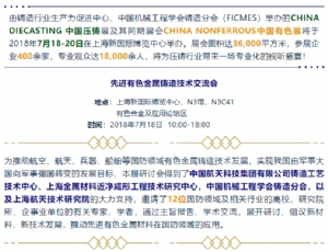 中國壓鑄展及其同期展會CHINA NONFERROUS中國有色展將于2018年7月18-20日在上海新國際博覽中心舉辦。