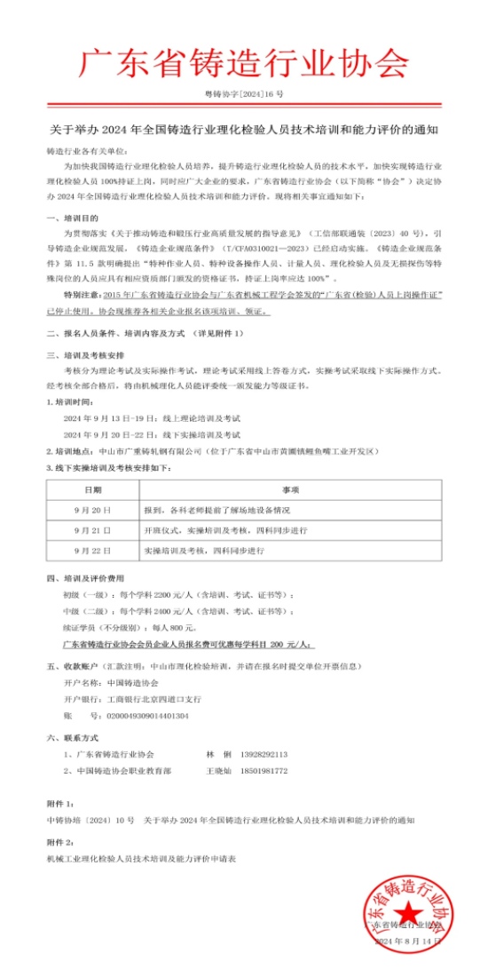 關于舉辦2024年全國鑄造行業理化檢驗人員技術培訓和能力評價的通知