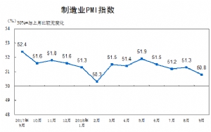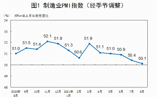 8月份,中國(guó)制造業(yè)采購(gòu)經(jīng)理指數(shù)為50.1%,比上月回落0.3個(gè)百分點(diǎn),繼續(xù)保持在擴(kuò)張區(qū)間。