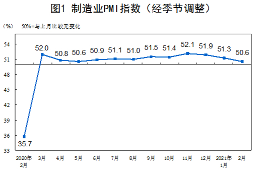 2021年2月,中國(guó)制造業(yè)采購(gòu)經(jīng)理指數(shù)(PMI)為50.6%,低于上月0.7個(gè)百分點(diǎn),連續(xù)12個(gè)月位于臨界點(diǎn)以上,制造業(yè)景氣水平較上月有所回落。