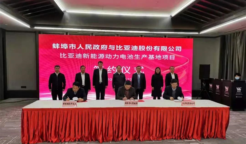 12月21日,蚌埠市政府與比亞迪股份有限公司在合肥舉行“比亞迪新能源動(dòng)力電池生產(chǎn)基地項(xiàng)目”簽約。