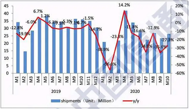 10月,國內手機市場總體出貨量2615.3萬部,同比下降27.3%;1-10月,國內手機市場總體出貨量累計2.52億部,同比下降22.1%。
