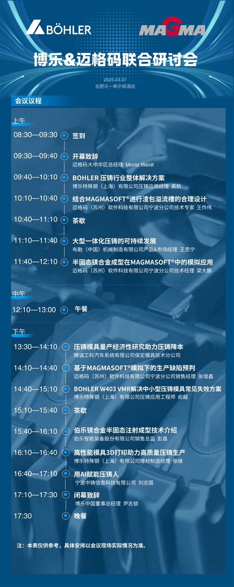 2025年10月31日,博樂特殊鋼、邁格碼聯(lián)合壓鑄研討會,將于廣東省廣州市南沙越秀喜來登酒店舉行。
