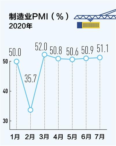 7月份,中國制造業(yè)采購經(jīng)理指數(shù)(PMI)為51.1%,比上月上升0.2個百分點,連續(xù)5個月位于臨界點以上。