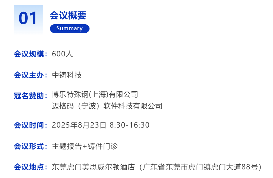 2025 年 8 月 23日(周六),博樂特殊鋼(上海)有限公司(后簡稱“博樂”)、邁格碼(寧波)軟件科技有限公司(后簡稱“邁格碼”)聯合冠名的“中鑄科技研討會(東莞站)”將于廣東東莞舉辦。