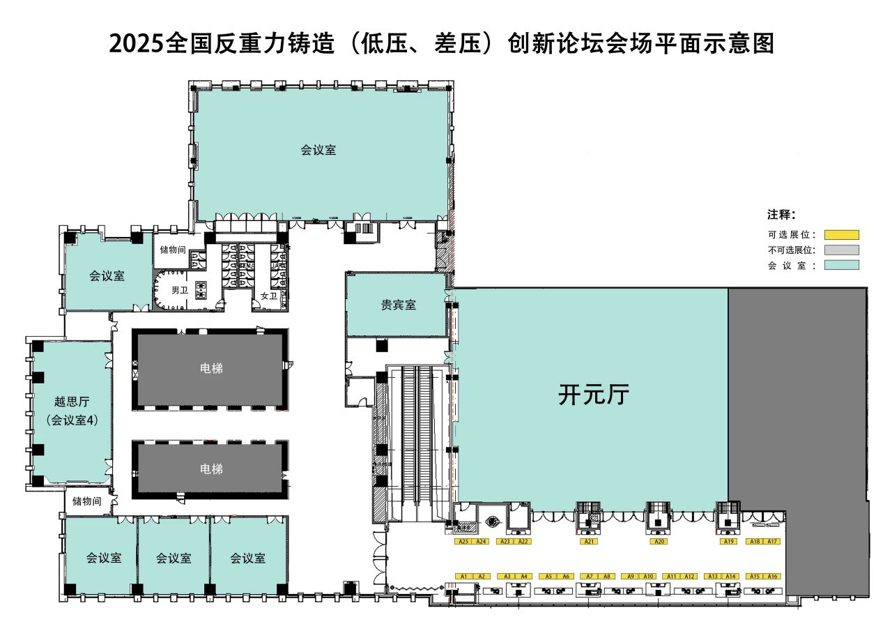 展位分布圖 ★展示費用:5000元/個 ★展示權益: 1. 提供展臺一個,1桌2椅,配套燈光,展臺由主辦方負責印刷搭建; 2. 免除參展單位一人會務費(原價1800元/人),包括五星級酒店自助餐、招待晚宴、資料費、場地、參觀等費用; 3. 微信發(fā)布的關于2025反重力鑄造論壇軟文時在文章底部掛參展單位公司logo; 4. 在論壇期間對展臺直播采訪,時間約為5min(自愿); 5. 在2025反重力鑄造論壇會刊中刊登參展單位公司/產品廣告; 6. 在壓鑄界微信公眾號推文中懸掛甲方banner廣告30天。 7. 提供發(fā)票,稅率為1%。 8. 與行業(yè)決策者面對面交流