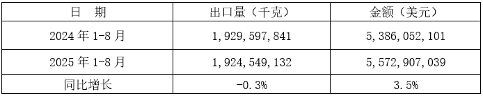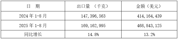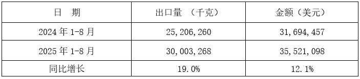 六、鑄模及鑄芯用粘合劑出口情況(稅則號:38241000) 1-8月鑄模及鑄芯用粘合劑共計出口3.0萬噸,同比增長19.0%。 其中:8月份出口0.41萬噸,同比增長11.0%,環(huán)比下降16.6%,見表21和表22。 表 21:2025年1-8月同比出口情況