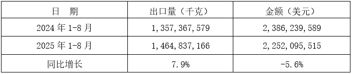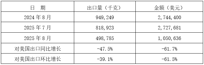 表 10:2025年8月汽車零部件對美國出口情況 三、金屬軋機用軋輥出口情況(稅則號:84553000) 1-8月金屬軋機用軋輥共計出口16.9萬噸,同比增長14.8%,對美國出口0.43萬噸,同比下降25.8%。 其中:8月份出口2.2萬噸,同比下降3.1%,環(huán)比下降10.9%,對美國出口0.05萬噸,同比下降47.5%,環(huán)比下降39.1%,見表11-表14。 表 11:2025年1-8月軋輥同比出口情況