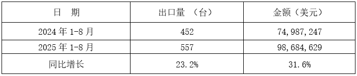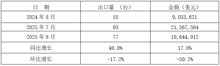 五、冷室壓鑄機出口情況(稅則號:84543010) 1-8月冷室壓鑄機共計出口557臺,同比增長23.2%。 其中:8月份出口77臺,同比增長40.0%,環(huán)比下降17.2%,見表19和表20。 表 19:2025年1-8月同比出口情況