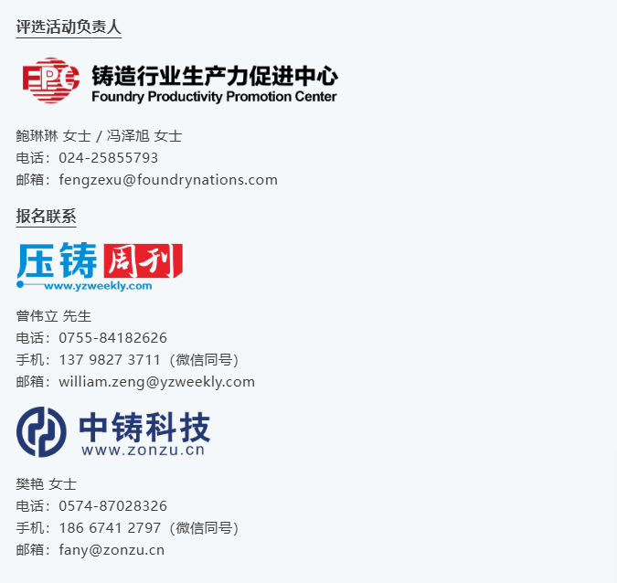 ![]() Award of Die Casting Innovative Technologies 創(chuàng)新技術(shù)評(píng)選活動(dòng) 歷經(jīng)20余年的高速發(fā)展,中國(guó)壓鑄行業(yè)目前已經(jīng)進(jìn)?到轉(zhuǎn)型升級(jí)的關(guān)鍵時(shí)期,協(xié)同創(chuàng)新與高質(zhì)量發(fā)展逐漸成為行業(yè)共識(shí)。為鼓勵(lì)及帶動(dòng)壓鑄行業(yè)相關(guān)企業(yè)技術(shù)與產(chǎn)品創(chuàng)新,在全行業(yè)形成創(chuàng)新風(fēng)尚,提升企業(yè)競(jìng)爭(zhēng)力,鑄造行業(yè)生產(chǎn)力促進(jìn)中心自2017年起在全行業(yè)組織開展“壓鑄行業(yè)年度創(chuàng)新技術(shù)與產(chǎn)品評(píng)選”活動(dòng)。截止目前,共認(rèn)定及表彰國(guó)內(nèi)外壓鑄領(lǐng)域創(chuàng)新技術(shù)與產(chǎn)品100余項(xiàng),極大的促進(jìn)了我國(guó)壓鑄行業(yè)的發(fā)展與技術(shù)進(jìn)步。 ♦ 提示:活動(dòng)全程不收取任何費(fèi)用! 2026 現(xiàn)將2026年度全國(guó)壓鑄行業(yè)創(chuàng)新技術(shù)與產(chǎn)品評(píng)選活動(dòng)相關(guān)事宜通知如下,歡迎相關(guān)企業(yè)及單位積極參與。 參與企業(yè)范圍 壓鑄及有色鑄造全產(chǎn)業(yè)鏈及上下游相關(guān)企業(yè)。 參評(píng)范圍 評(píng)選對(duì)象包括壓鑄及有色鑄造行業(yè)的創(chuàng)新產(chǎn)品、創(chuàng)新技術(shù)、創(chuàng)新材料、創(chuàng)新工藝、創(chuàng)新應(yīng)用等。