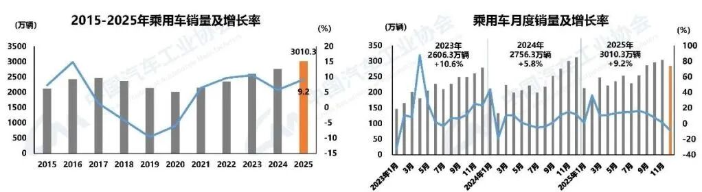 ![]() 據(jù)中國汽車工業(yè)協(xié)會最新數(shù)據(jù)分析顯示,2025年中國汽車行業(yè)頂住貿(mào)易保護、全球產(chǎn)業(yè)鏈重構等外部壓力,成功攻克技術攻關難題、破解行業(yè)內(nèi)卷等多重挑戰(zhàn),實現(xiàn)產(chǎn)業(yè)規(guī)模與發(fā)展質(zhì)量雙提升,全年汽車產(chǎn)銷量再創(chuàng)歷史新高,連續(xù)17年穩(wěn)居全球第一,展現(xiàn)出強勁的發(fā)展韌性與活力。 數(shù)據(jù)顯示,2025年我國汽車產(chǎn)銷連續(xù)三年保持3000萬輛以上規(guī)模,全年產(chǎn)銷量分別完成3453.1萬輛和3440萬輛,同比分別增長10.4%和9.4%。其中,乘用車板塊表現(xiàn)穩(wěn)健,全年產(chǎn)銷量首次突破3000萬輛大關,分別完成3027萬輛和3010.3萬輛,同比分別增長10.2%和9.2%,為行業(yè)整體增長奠定堅實基礎。