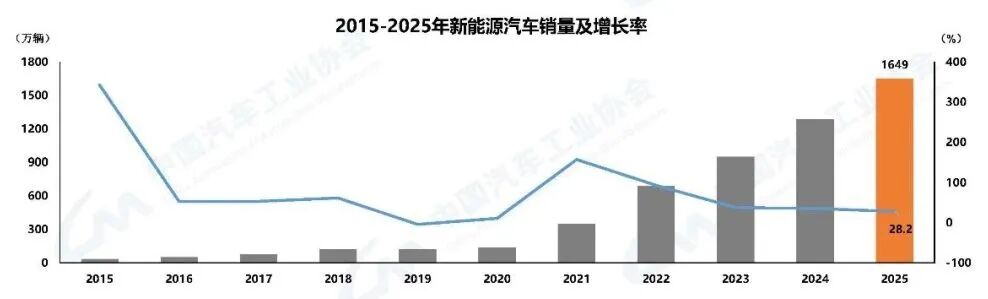 新能源汽車依舊是行業(yè)增長的核心動力,我國新能源汽車產(chǎn)銷量已連續(xù)11年位居全球第一。2025年,在政策利好加持、產(chǎn)品供給豐富、基礎設施持續(xù)完善等多重積極因素共同作用下,新能源汽車市場持續(xù)擴容,產(chǎn)銷量成功突破1600萬輛,分別完成1662.6萬輛和1649萬輛,同比分別增長29%和28.2%。值得關注的是,2025年新能源汽車新車銷量占汽車新車總銷量的比例達47.9%,較去年同期提升7個百分點,產(chǎn)業(yè)電動化轉(zhuǎn)型進程持續(xù)加速。