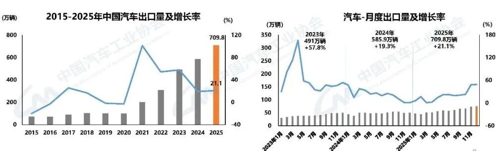 海外市場開拓成效顯著,成為拉動行業(yè)增長的另一重要引擎。2025年,國內(nèi)汽車企業(yè)愈發(fā)重視海外市場布局,中國品牌國際競爭力持續(xù)提升,合資企業(yè)出口同樣表現(xiàn)亮眼,疊加新能源汽車出口的快速增長,推動我國汽車出口再上新臺階。全年汽車出口量達709.8萬輛,首次突破700萬輛大關,同比增長21.1%。其中,新能源汽車出口表現(xiàn)尤為突出,全年出口261.5萬輛,同比激增1倍,成為出口增長的核心驅(qū)動力。