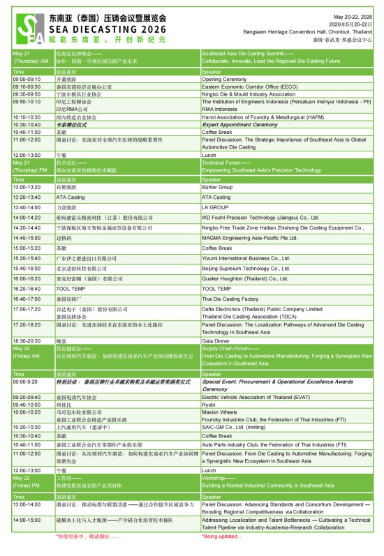 ![]() 4場圓桌×20+演講,60+展位熱銷,免費預登記享好禮 東南亞唯一專注壓鑄產業的國際會議與展覽——第三屆東南亞(泰國)壓鑄會議暨展覽會(SEA DIECASTING 2026),將于2026年5月20–22日在泰國春武里邦盛會議中心隆重舉辦。 依托前兩屆成功積淀,本屆大會全面升級、落位泰國東部經濟走廊(EEC)核心區域,匯聚全球資源,共筑東南亞壓鑄產業新高地。目前60+展位已熱銷,觀眾免費預登記正式啟動,誠邀全球業界共襄盛舉,預計將吸引逾1500+專業觀眾參與。