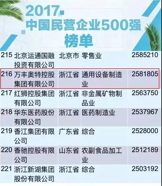 ![]() 2017年8月24日,由全國工商聯主辦的“2017中國民營企業500強發布暨民營經濟發展峰會”在濟南召開,這不僅是一次民營企業500強的風采展示會,更是弘揚企業家精神,提振企業發展信心的盛會。會上,全國工商聯權威發布了2017“中國民營企業500強”榜單,萬豐奧特控股集團再次蟬聯500強位列216位,同時榮列“中國民企制造業500強”第128位。