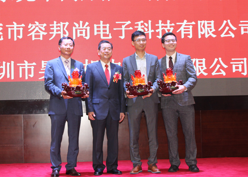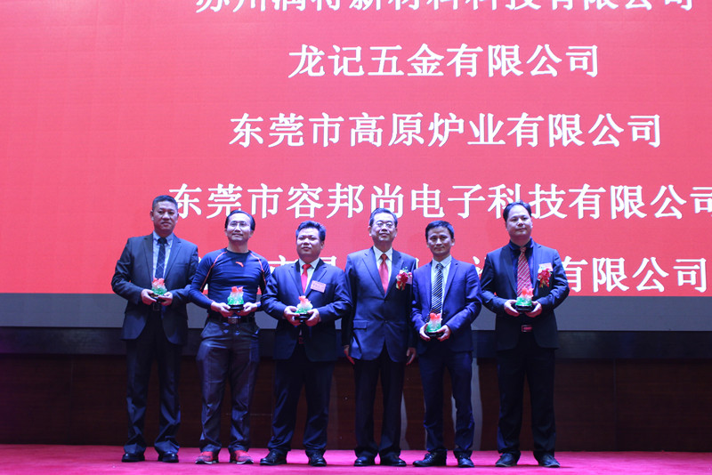 銅牌贊助商頒授紀念獎杯 本屆晚會的成功籌辦,離不開會員企業的慷慨贊助。領導致辭完畢,香港鑄造業總會會長劉相尚先生分別為三家金牌贊助商力勁機械國際有限公司、訊通展覽有限公司、東莞市肯納特壓鑄特鋼有限公司,兩家銀牌贊助商嘉瑞國際有限公司、樂豐制造廠有限公司,五家銅牌贊助商蘇州潤特新材料科技有限公司、東莞市高原爐業有限公司、東莞市容邦尚電子科技有限公司、龍記五金有限公司、深圳市昊丹機電設備有限公司代表頒發紀念獎杯。