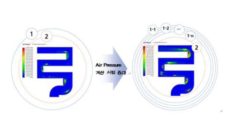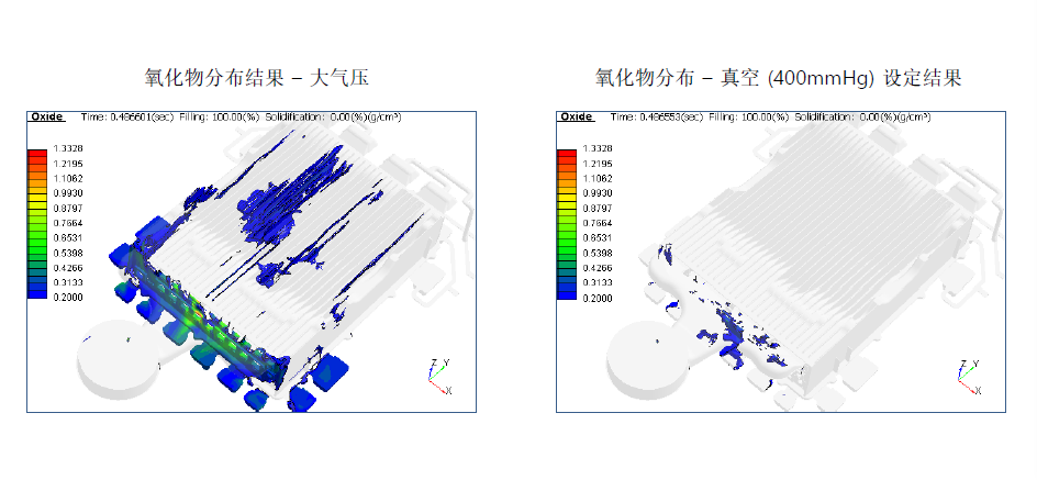考慮到真空(氣體壓力)的氧化夾渣生產(chǎn)與追蹤的改善,將氧化夾渣的預測結(jié)果準確性提升。 Air Pressure 運算法則改善 追蹤金屬液和空氣接觸的自由表面的運算法則被改善。通過使用這個改善后的運算法則來求解計算,預測Air Pressure結(jié)果孤立氣體的發(fā)生區(qū)域的準確性被提升。